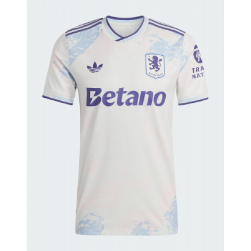 Футболка выполнена в светлой палитре с нежными голубыми акцентами и абстрактным узором на рукавах и нижней части. Дизайн дополнен фиолетовыми элементами — клубным гербом, логотипом спонсора и полосками на плечах, что придаёт образу свежесть и современный характер. Модель изготовлена из лёгкой и дышащей спортивной ткани, обеспечивающей комфорт при носке и тренировках. Продуманный крой сохраняет свободу движений, а качественная отделка гарантирует долговечность. Идеальный вариант для болельщиков «Астон Виллы», которые хотят подчеркнуть поддержку команды и выделяться в необычном клубном стиле.