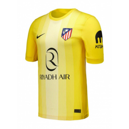 Вратарская форма «Атлетико Мадрид» сезона 2025/26 от Nike выполнена в ярком жёлтом цвете с плавным градиентом и тонкими вертикальными линиями, создающими эффект динамики и энергии. На груди размещены логотип клуба и спонсора Riyadh Air, а также фирменный знак Nike. Материал с технологией Dri-FIT обеспечивает превосходную вентиляцию и отвод влаги, помогая вратарю сохранять комфорт и концентрацию на протяжении всего матча.