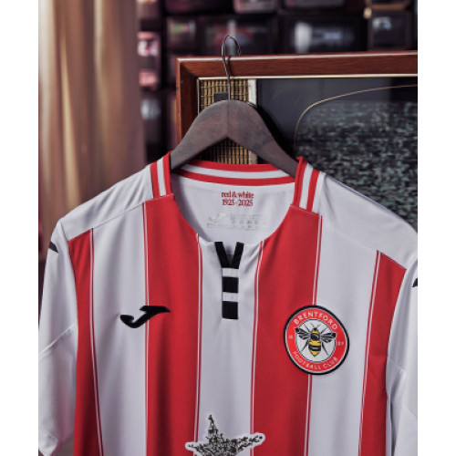 Брентфорд футболка домашняя 2025/26 Домашняя футболка «Брентфорда» сезона 2025/26 выполнена в традиционном стиле клуба — вертикальные красно-белые полосы подчеркивают исторический облик команды. Манжеты и воротник с красными акцентами добавляют аккуратные детали в классический дизайн. Ткань с современными технологиями обеспечивает комфорт, вентиляцию и свободу движений во время игры и активных тренировок. На груди размещены клубный герб, логотип Joma и спонсорская надпись, подтверждающие подлинность экипировки и её связь с Английской премьер-лигой. Классика «пчёл», которая будет узнаваема на каждом матче.