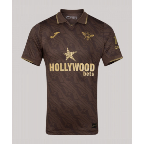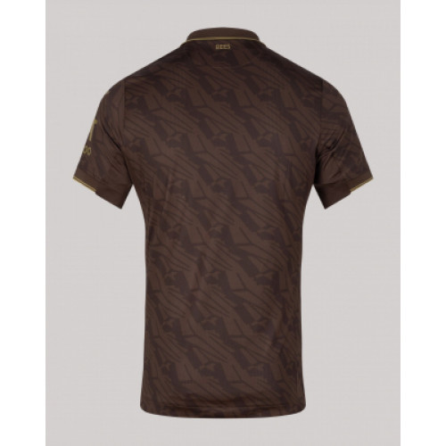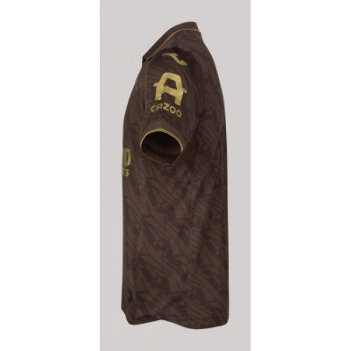 Брентфорд футболка гостевая 2025/26 Гостевая футболка «Брентфорда» сезона 2025/26 выполнена в необычном коричневом цвете, который выгодно выделяет команду на выезде. Золотые детали — логотипы, нашивки и аккуратные линии на воротнике и рукавах — придают дизайну элегантность и подчеркивают премиальный характер экипировки. Основу ткани составляет инновационный спортивный материал, который обеспечивает лёгкость, хорошую вентиляцию и комфорт даже при интенсивных нагрузках. На груди размещены клубный герб в золотом исполнении, фирменный знак Joma и спонсорская надпись, подтверждающие подлинность формы и её связь с Английской Премьер-лигой. Эта форма символизирует современный подход клуба, сохраняя при этом узнаваемый стиль «пчёл». Она подойдёт не только для матчей, но и станет ярким элементом в коллекции любого болельщика.
