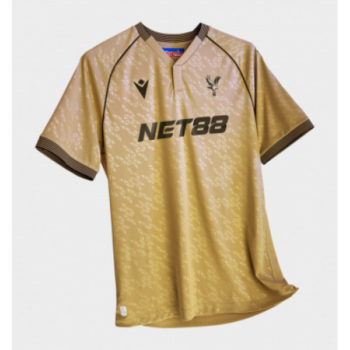 Кристал Пэлас футболка резервная 2025/26 Резервная футболка «Кристал Пэлас» сезона 2025/26 выполнена в изысканном золотистом оттенке с тонким геометрическим узором по ткани, что придаёт форме стильный и современный вид. Чёрные детали на манжетах и воротнике создают аккуратный контраст и подчёркивают премиальный характер дизайна. На груди расположен клубный герб в минималистичном чёрном варианте, логотип производителя и спонсорская надпись NET88, а на спине под воротником — эмблема «орлов», придающая дополнительную идентичность экипировке. Футболка выполнена из лёгкого технологичного материала, который обеспечивает отличную вентиляцию, комфорт и свободу движений как во время матча, так и при повседневной носке. Эта модель — элегантная альтернатива основной форме, идеально подходящая для болельщиков, которые хотят выделяться и оставаться верными «Кристал Пэлас».