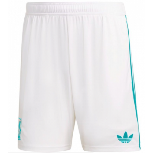 Резервные шорты "Ливерпуль" на сезон 2025/26. Выполнены в белом цвете с бирюзовыми логотипами.