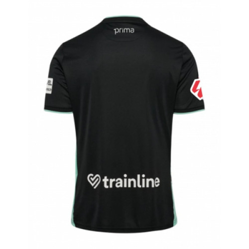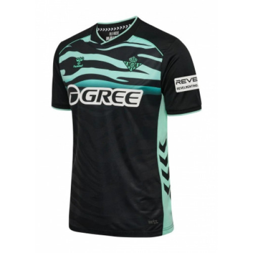 Резервная форма «Реал Бетис» сезона 2025/26 от Hummel выполнена в стильном сочетании чёрного и мятного цветов. Узор в виде абстрактных полос создаёт динамичный и дерзкий образ, перекликаясь с энергетикой клуба. На груди размещены логотип спонсора GREE и эмблема Бетиса, выполненная в минималистичном однотонном варианте. Воротник с фирменной внутренней лентой Hummel и надписью “En la noche que lo di todo” («В ночь, когда я отдал всё») добавляет особое настроение. Материал с технологией BeeCool обеспечивает комфорт, лёгкость и отличную вентиляцию при любой активности.