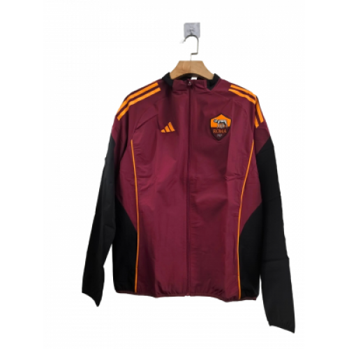 Ветровка AS Roma (Рома) на сезон 2025/2026 в бордовом цвете — это часть официальной тренировочной и фанатской коллекции клуба. Модель выполнена в глубоком вишнево-бордовом оттенке, который отсылает к историческим комплектам команды начала 90-х годов. Ветровка имеет современный спортивный крой. На груди расположены термопринт или вышивка с эмблемой клуба и логотипом.Характерные три полоски на рукавах могут быть выполнены в контрастном оранжевом или золотистом цвете, что является традиционным сочетанием для «джаллоросси».