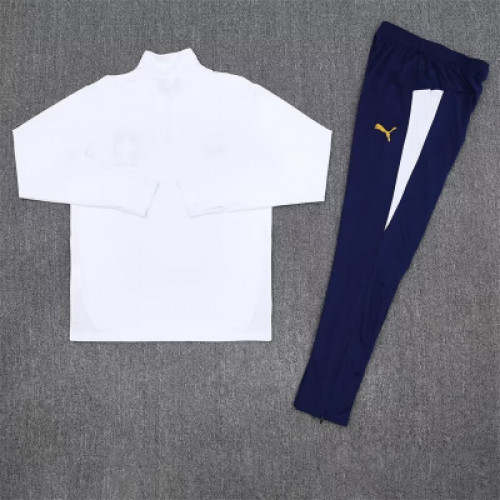 Спортивный костюм сборной Португалии с чистым белым верхом и контрастными синими штанами — стильное и гармоничное сочетание для тренировок и повседневной носки. Олимпийка с короткой молнией и аккуратным воротником, дополнена эмблемой команды и лаконичными вставками. Зауженные штаны с эластичным поясом и символикой обеспечивают комфорт и свободу движений. Отличный выбор для футбольного образа.